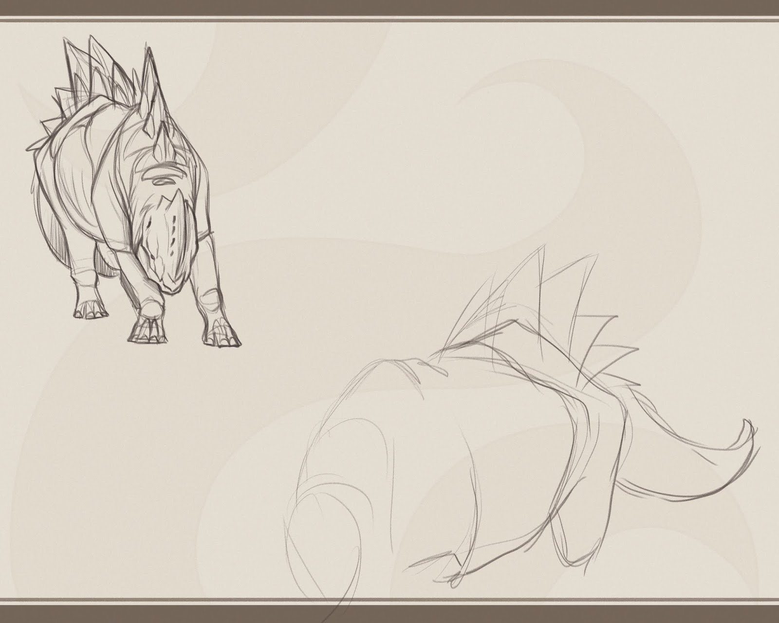 a lot of inspiration from the stegosaurus, pangolin, and javan rhino.